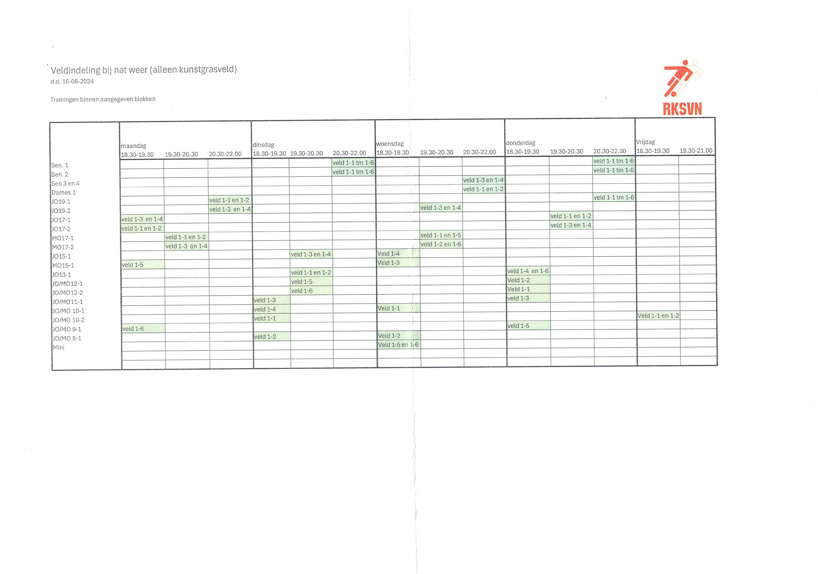 Het slecht weer schema geldt vandaag en hierdoor kan er alleen op het kunstgrasveld getraind worden. Zie onderstaand schema voor de indeling van het veld.